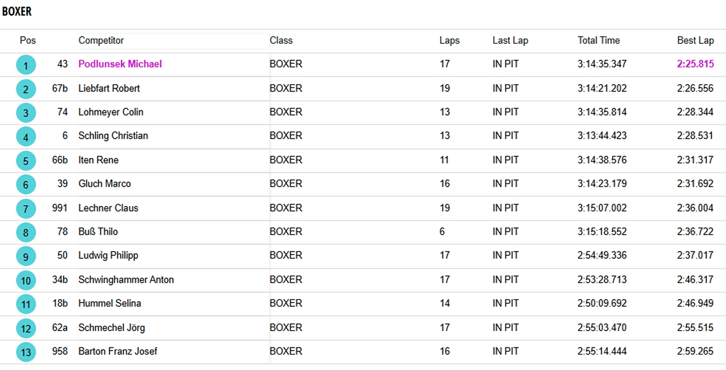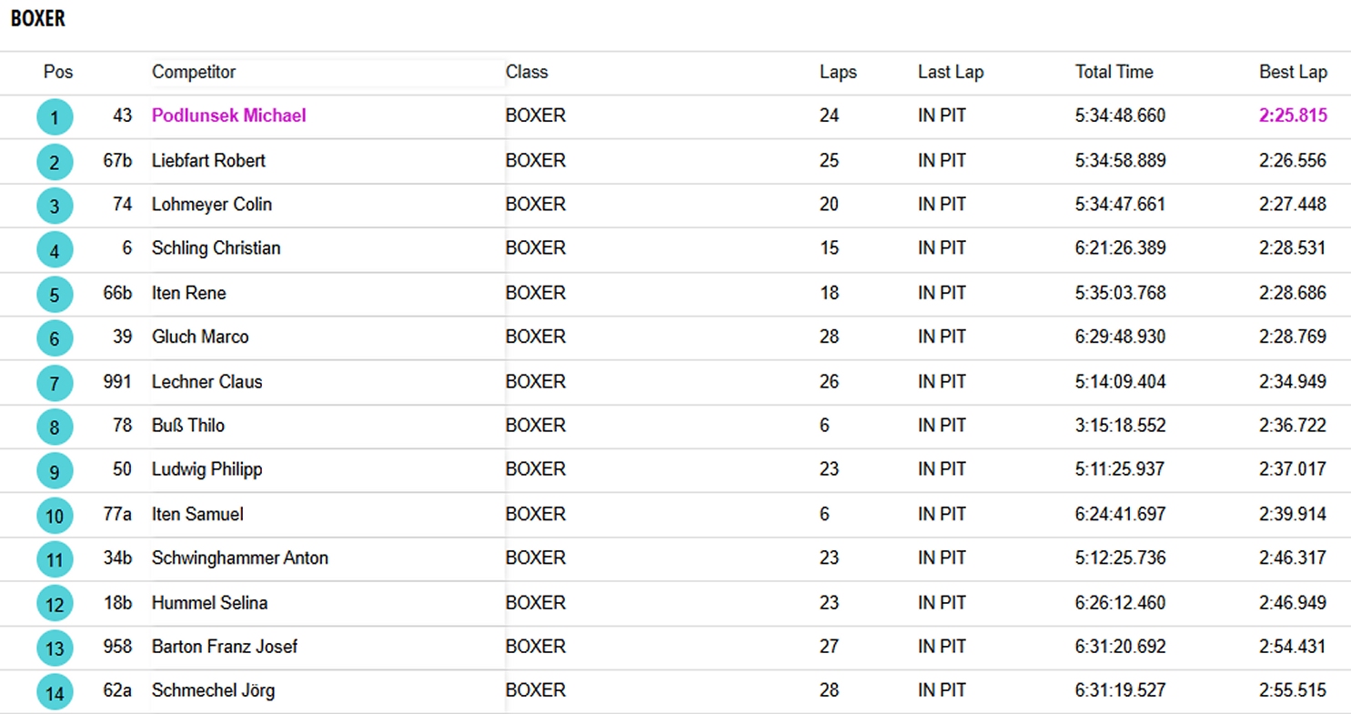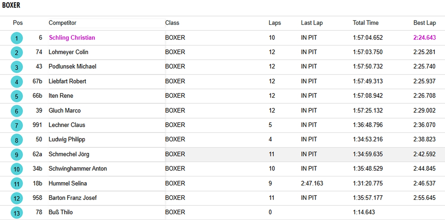 RE: BC 23. - 25. Mai 2025 Slovakiaring 1 Fr Vm - Wob - 23.05.2025 Die Freitag Vormittagzeiten. Der Chef hat zugeschlagen! ![]() Zum Vergrößern klicken Fahren Teams/Fahrer bei der Langstrecke (Start 15:50) mit? Teamname/Startnummer? RE: BC 23. - 25. Mai 2025 Slovakiaring 1 Fr - Wob - 23.05.2025 14 Piloten waren am Freitag unterwegs: Zum Vergrößern klicken Nochmal die Frage: Fahren Teams/Fahrer bei der Langstrecke (Start 15:50) mit? Teamname/Startnummer? RE: BC 23. - 25. Mai 2025 Slovakiaring 1 Endurance - Wob - 23.05.2025 Beim Langstreckenrennen konnte ich 3 Boxerteams erkennen, wer wo gefahren ist, ist mangels Info von der Strecke nicht bekannt. Die Plätze 12, 13 und 25 bei 33 startenden Teams wurden erreicht. Zum Vergrößern klicken RE: BC 23. - 25. Mai 2025 Slovakiaring 1 Endurance - Wob - 23.05.2025 Hier diie Teams im Langstreckenrennen: Boxercup 1 #74: Colin Lohmeyer, Christian Schling, Marco Gluch Boxercup 2 #43: Robert Liebfahrt, Potti Podlunsek, René Iten R11S #50 (R1100S Team): Philipp Ludwig, Keke Lechner, Selina Hummel, Anton Schwinghammer Wer ist bei Boxercup 1 die 2:24.552 (Boxer Tagesbestzeit) gefahren? RE: BC 23. - 25. Mai 2025 Slovakiaring 1 - Kleiner78 - 24.05.2025 Moin, Tages-Bestzeit wurde von Christian Schling auf einer HP2 (Ersatzmoped von Potti) gefahren. Das wird heute noch spannend in der Zeiten-Liste. Gruß Thilo #78 RE: BC 23. - 25. Mai 2025 Slovakiaring 1 - Wob - 24.05.2025 Infos vom Freitag von Potti von der Rennstrecke: Bestzeit im Zeittraining "Potti" Michael Podlunsek 2:25.815. Christian Schling hatte Probleme mit seiner 12S, fuhr im Langstreckenrennen mit Pottis Reserve-HP2 Tagesbestzeit in 2:24.552. Bei Thilo Buß leckte die Benzinleitung, sollte für heute aber OK sein.