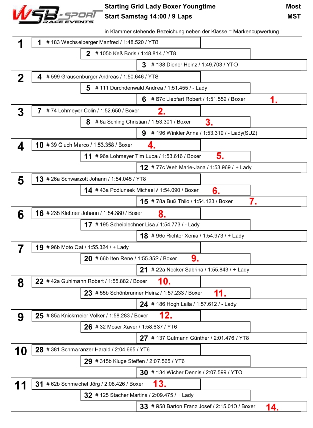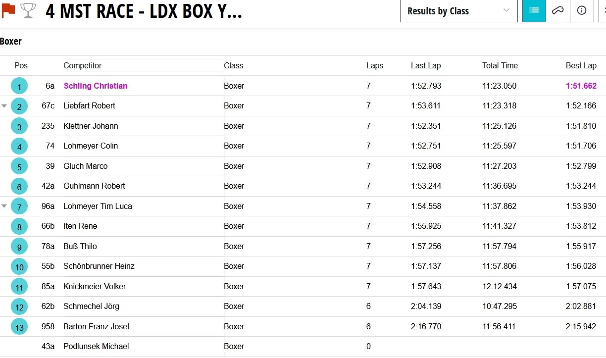 ------------------------------------------------------- ------------------------------------------------------- (13.07.2024, 14:40)Wob schrieb: Inoffizielles Ergebnis leider falsch, hier das offizielle Ergebnis Rennen 1, Sieger der Vizemeister der letzten beiden Jahre "Robbox" Liebfart:Eine Fahrerin aus dem Lady's Cup ist gestürzt, darauf hin folgte der Abbruch. Es geht ihr nach ersten Infos den Umständen entsprechend gut. Die neben meinem Namen stört mich scho a weng....