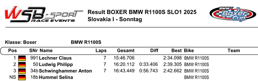 Premieren- und Doppelsieg für Christian Schling mit Bestzeit. Gratulation! Boxercup Zum Vergrößern klicken R1100S Wertung Zum Vergrößern klicken -------------------------------------------------------