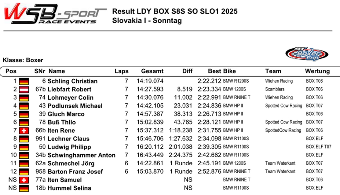 Premieren- und Doppelsieg für Christian Schling mit Bestzeit. Gratulation! Boxercup Zum Vergrößern klicken R1100S Wertung Zum Vergrößern klicken -------------------------------------------------------