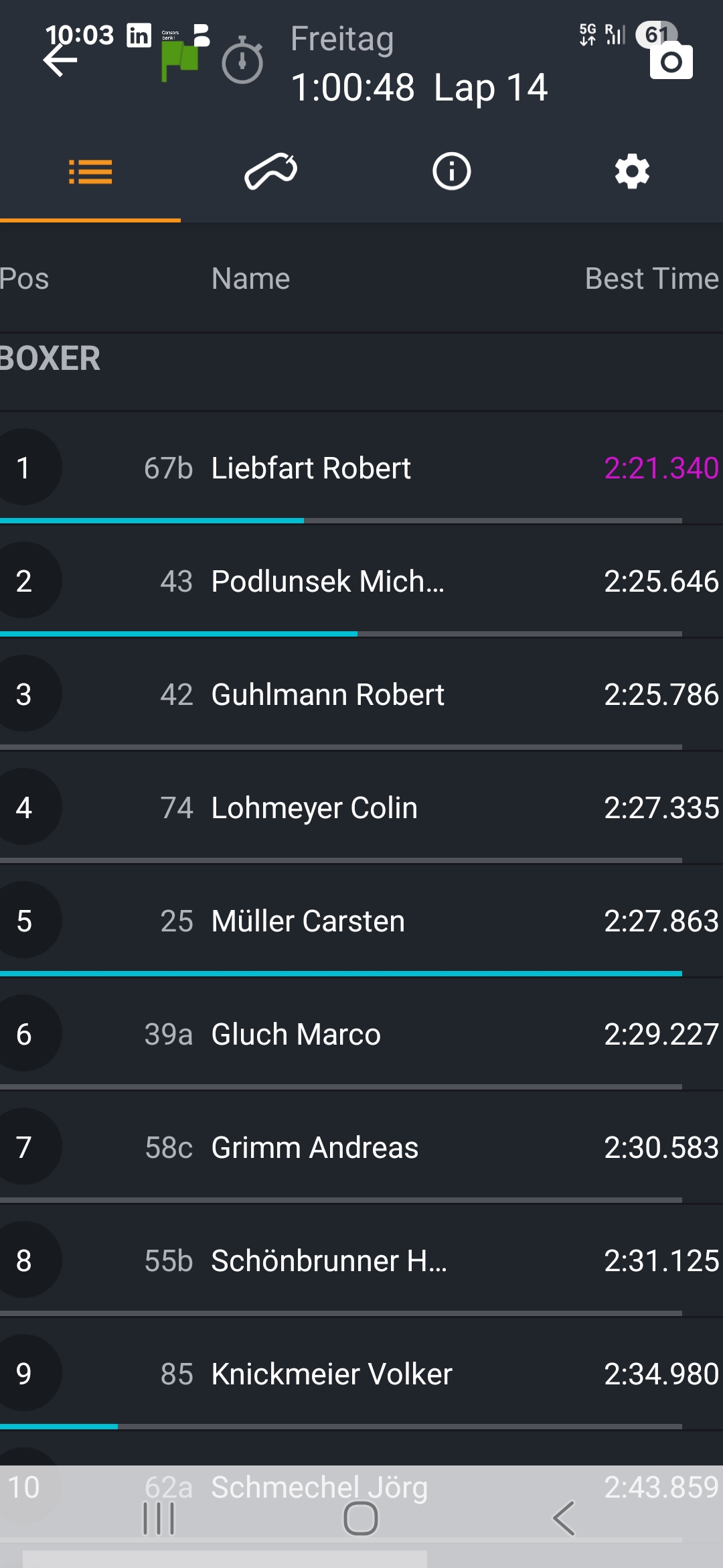 Der neue Asphalt dürfte hervorragend sein, im 2. Turn wurde durch Meister Liebfart die vorjährige Trainingsbestzeit (auch von ihm) mit 2:19,7 um 3 Sekunden unterboten!